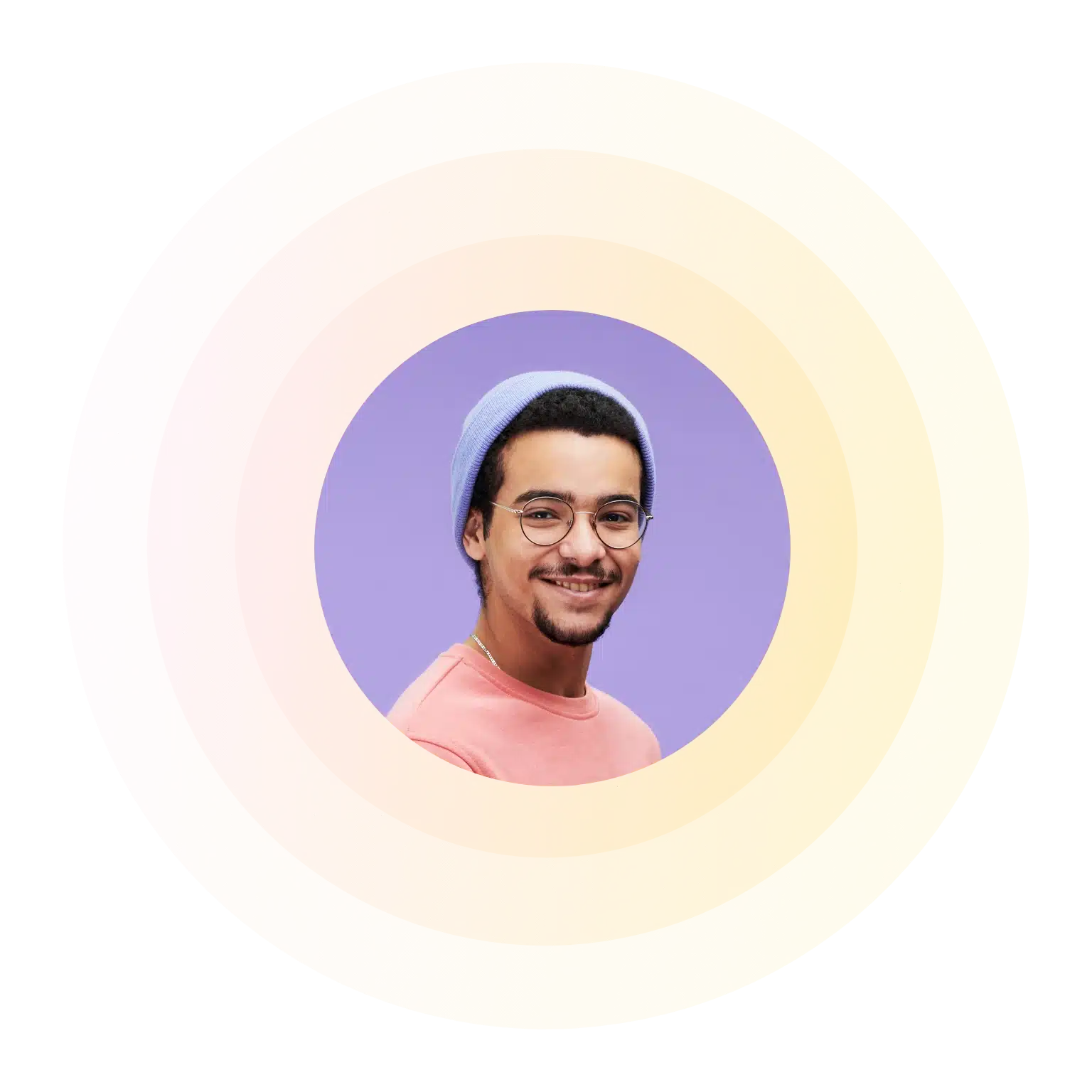 A man in a white shirt smiles and looks to the side against a pink background, reminiscent of someone contemplating the Wonderlic Test. The image is adorned with abstract pink and purple circular shapes intersected by playful yellow lines.